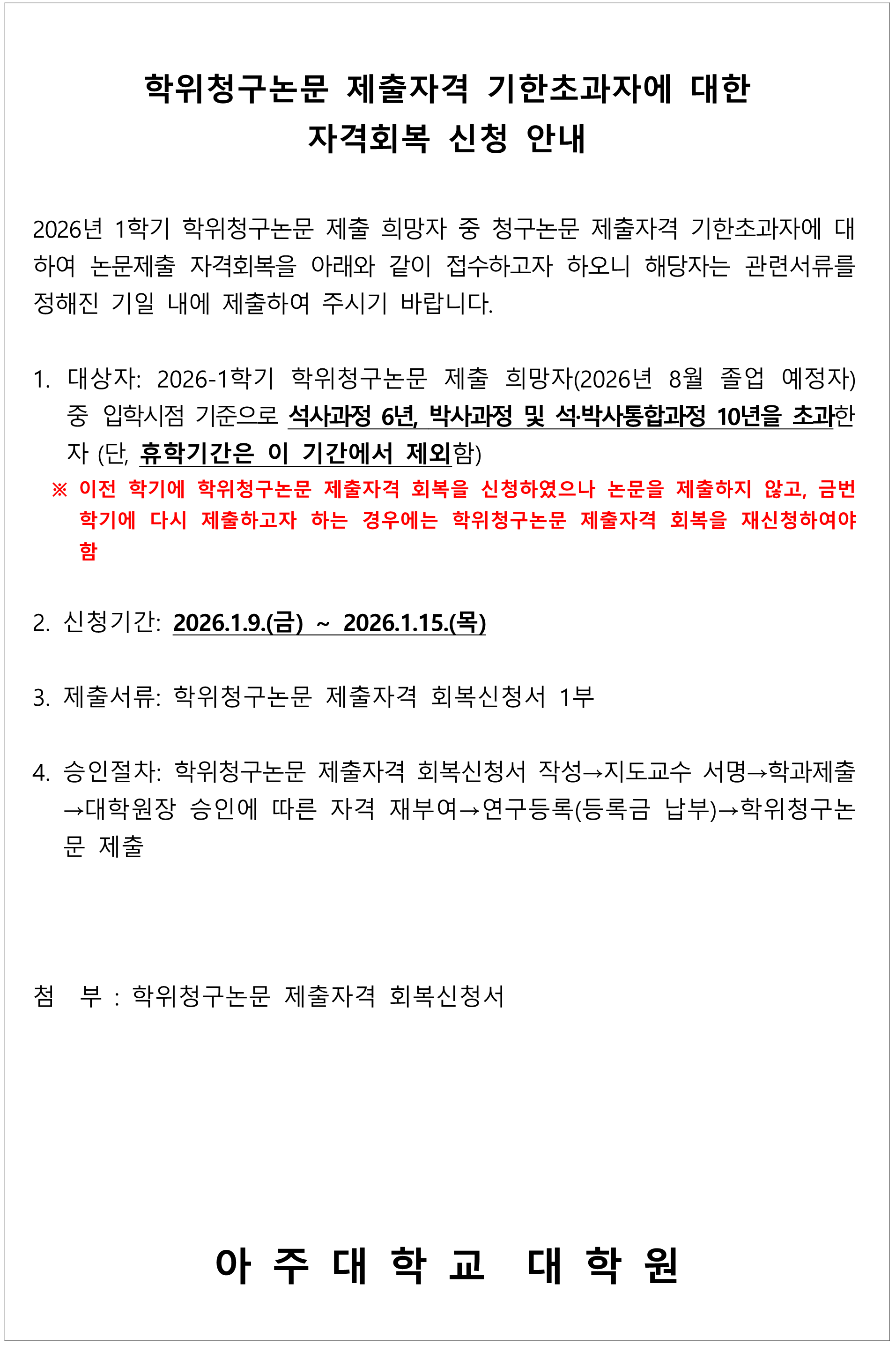2026학년도 1학기 학위청구논문 제출자격 기한초과자 자격회복 신청 안내