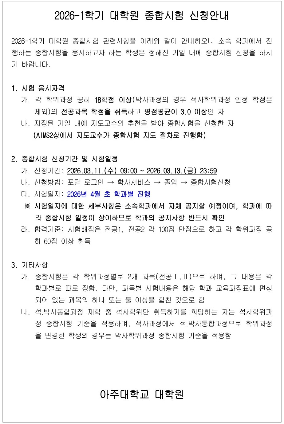 2026-1학기 대학원 종합시험 신청 안내