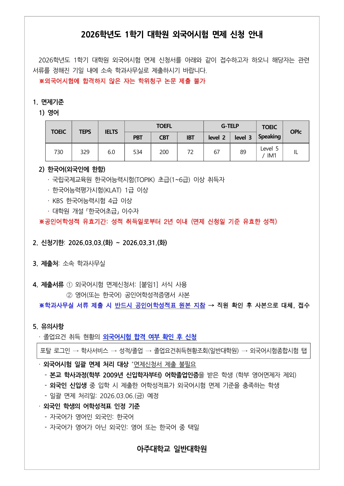 2026학년도 1학기 대학원 외국어시험 면제 신청 안내